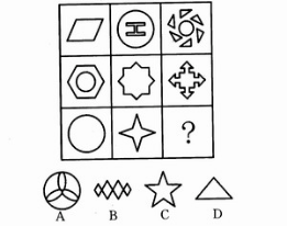 第一題,圖形比較規(guī)則、整齊,考查對稱性,即中心對稱圖形。選擇B項。