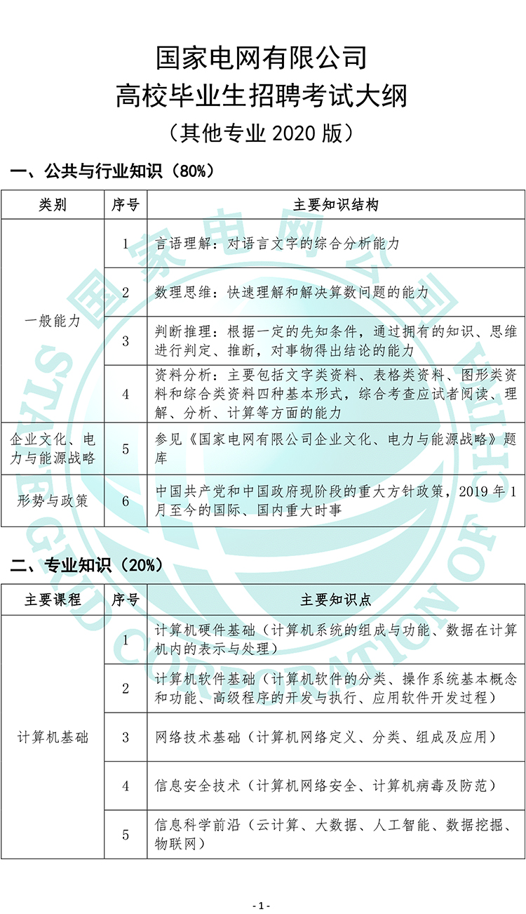 2020國家電網公司高校畢業生招聘考試大綱(其他專業2020版)