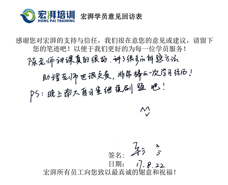 宏湃國(guó)網(wǎng)培訓(xùn)保進(jìn)尊享服務(wù)為小班化教學(xué)。 班主任會(huì)不定期進(jìn)入系統(tǒng)抽查學(xué)員的學(xué)習(xí)情 況,對(duì)于完成進(jìn)度交叉的學(xué)員會(huì)及時(shí)督促。 在上課期間每天面授課結(jié)束會(huì)安排自習(xí)時(shí)間, 班主任會(huì)發(fā)放當(dāng)天的習(xí)題,而且第二天會(huì)逐 一檢查完成度。